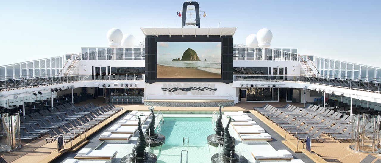 La terraza de la piscina ofrece películas bajo un cielo estrellado.