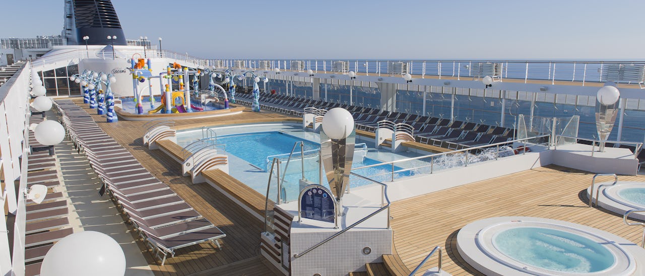 Disfrute de hermosas piscinas y jacuzzis, gimnasio y spa en las cubiertas superiores.