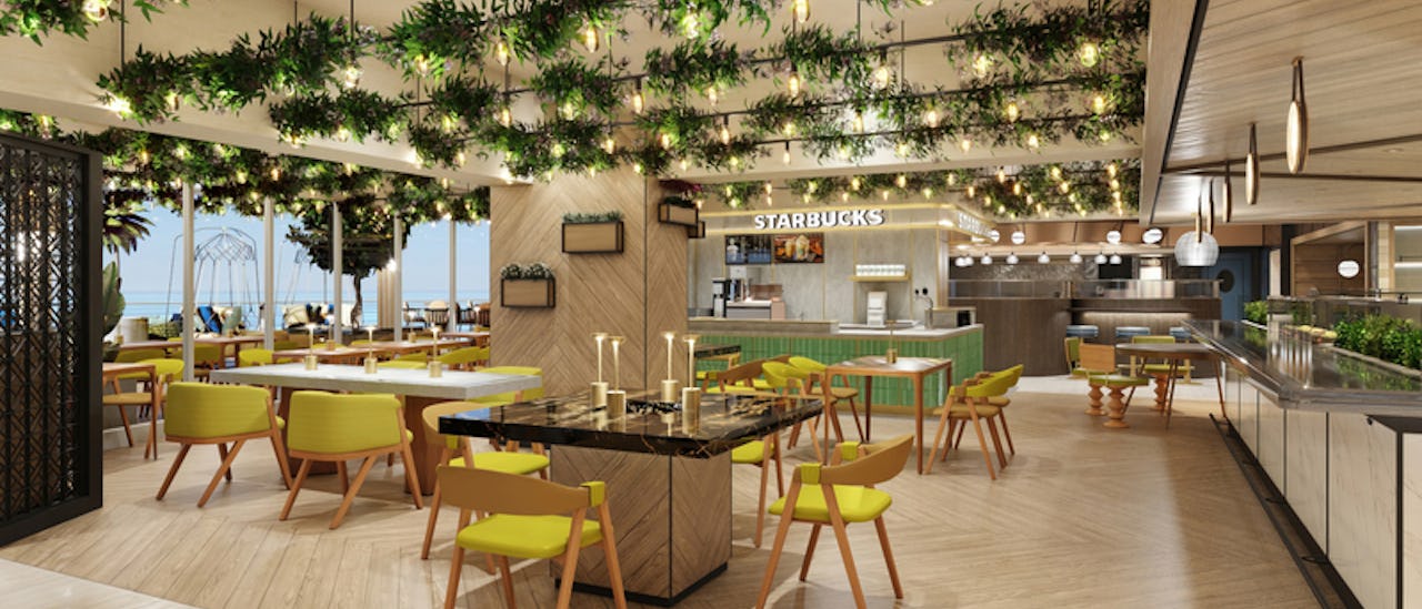 At the heart of the ship is the Penrose Atrium, a three-deck-high space that serves as a gateway to its many restaurants and bars. Designed by Miami-based Studio Dado